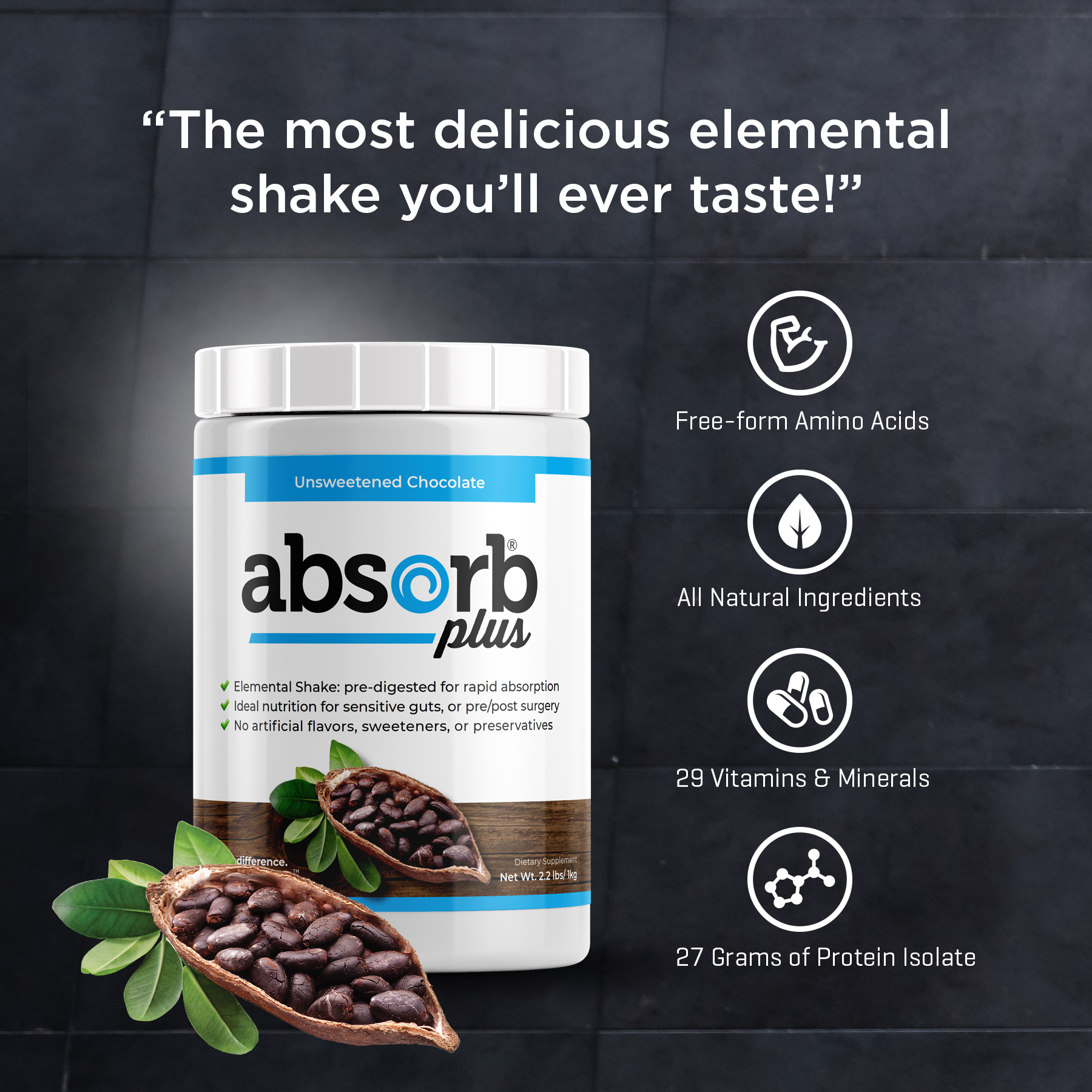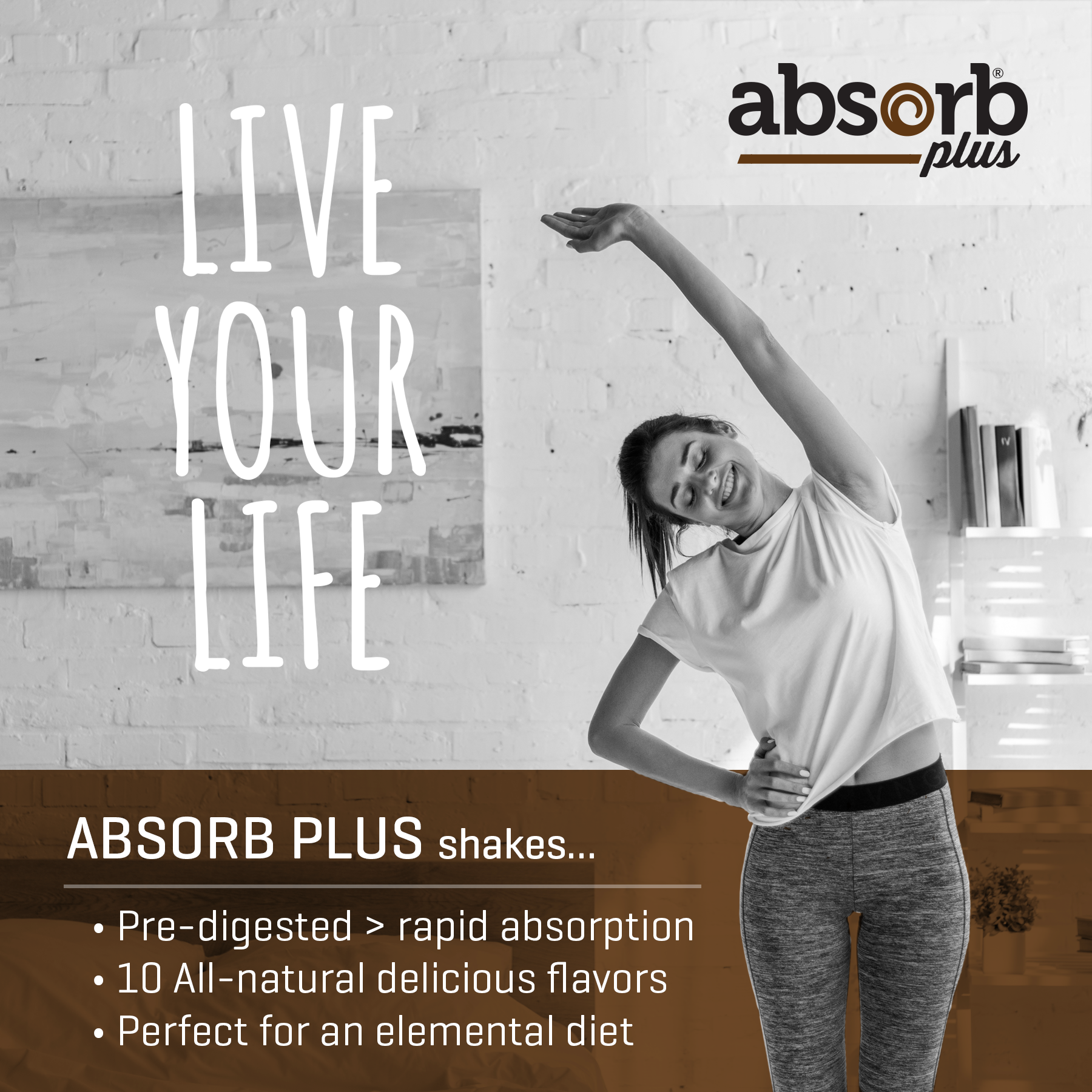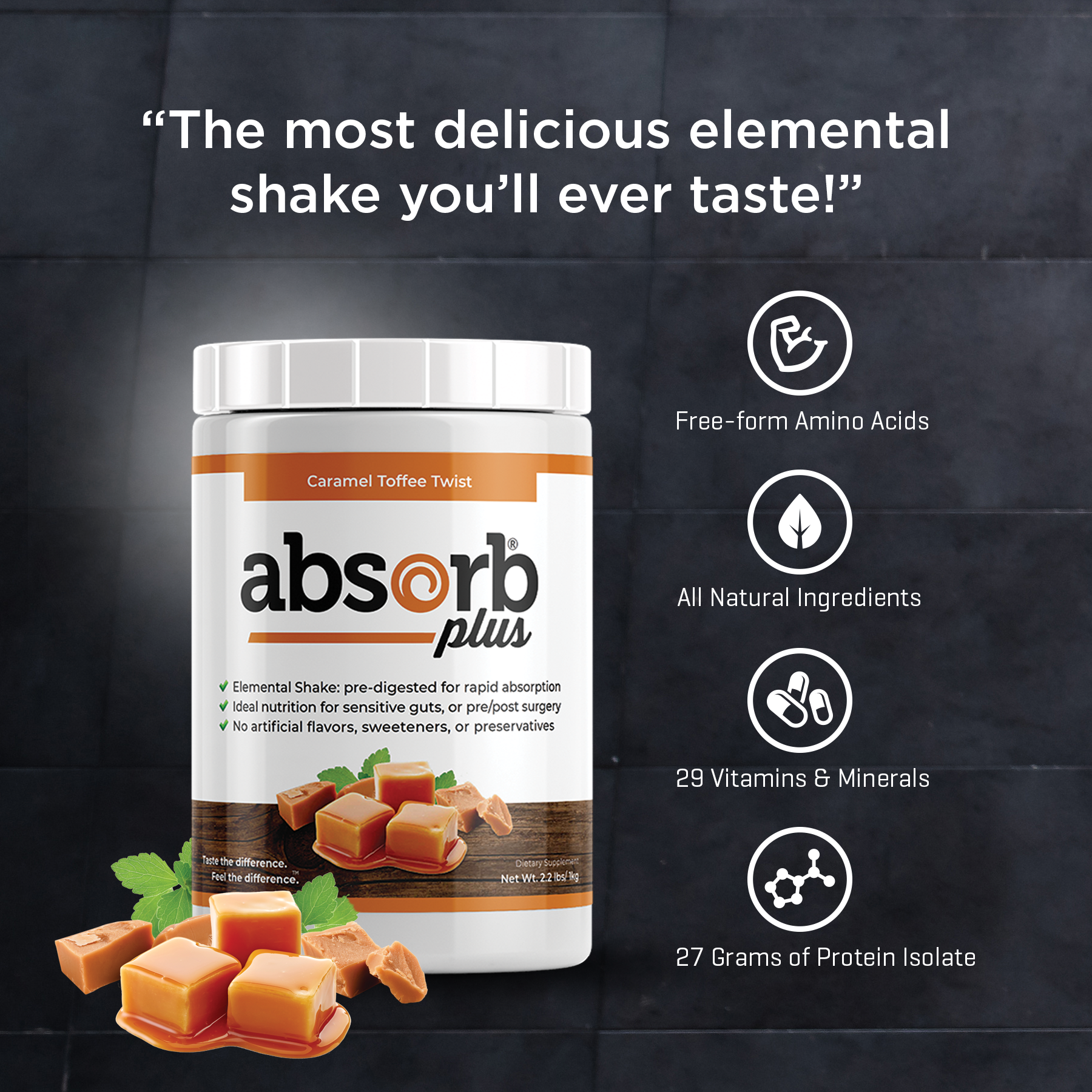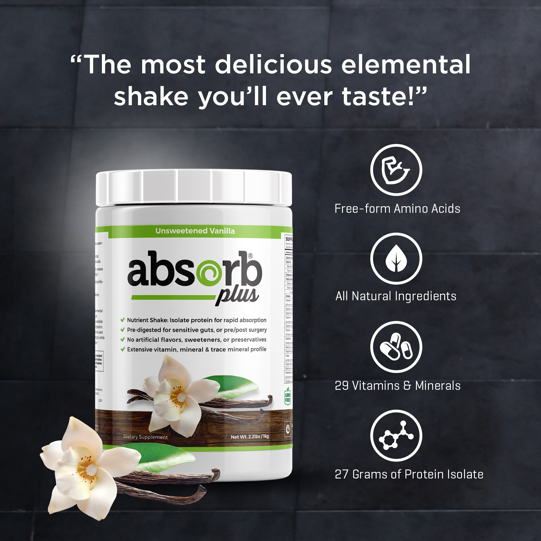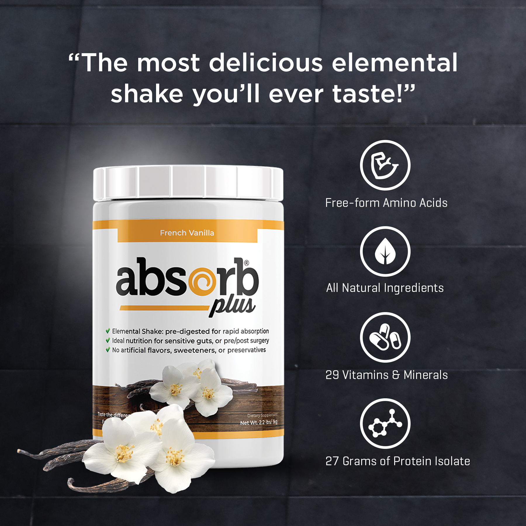 Absorb Plus was formulated by colon and bowel disorder expert Jini Patel Thompson to provide maximum nutrition to help build and strengthen your immune system and allow you to maintain or gain solid weight (muscle, not fat). Absorb Plus provides nutrients, supplements, protein (cold-extracted, lactose-free whey protein isolate) and carbohydrates (tapioca maltodextrin - from cassava root) in the most desirable forms and proportions, and in ratios that allow for optimum use and absorption. This liquid diet protein shake also includes an extensive array of therapeutic free-form amino acids (over 1000 mg L-Glutamine per serving!), with a superior vitamin and mineral profile (including trace minerals). Finally, Absorb Plus tastes so good, you can consume it up to 12 times a day if necessary!