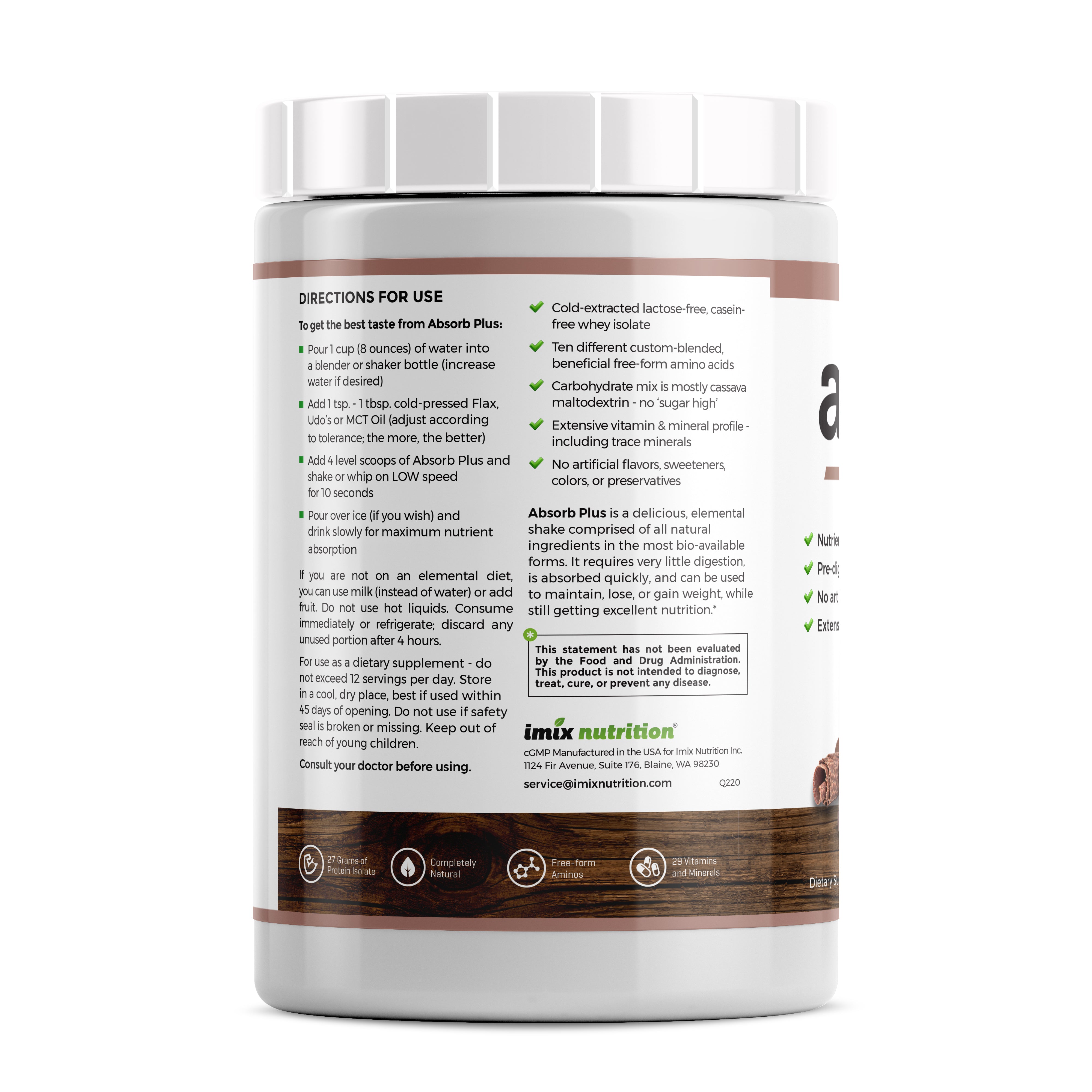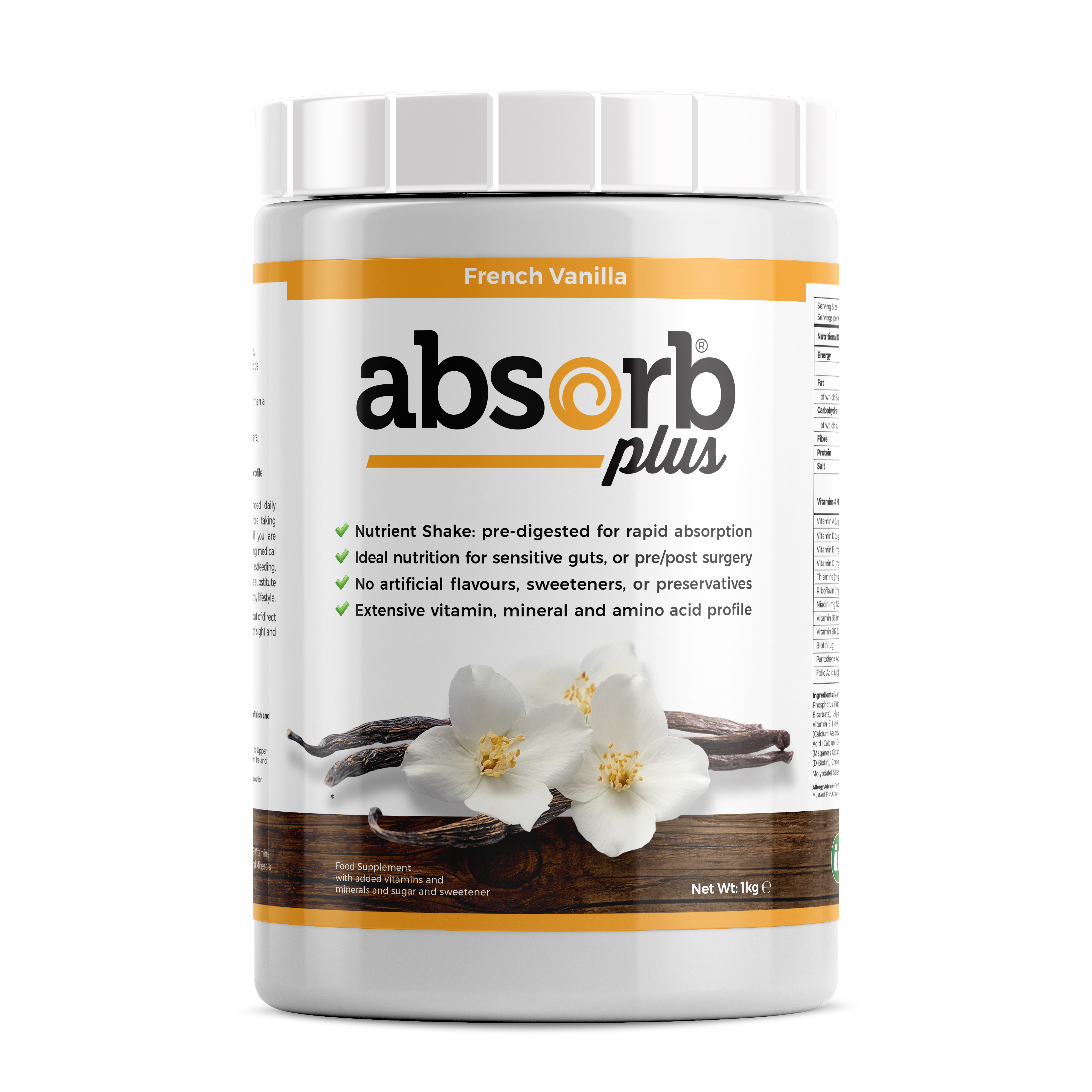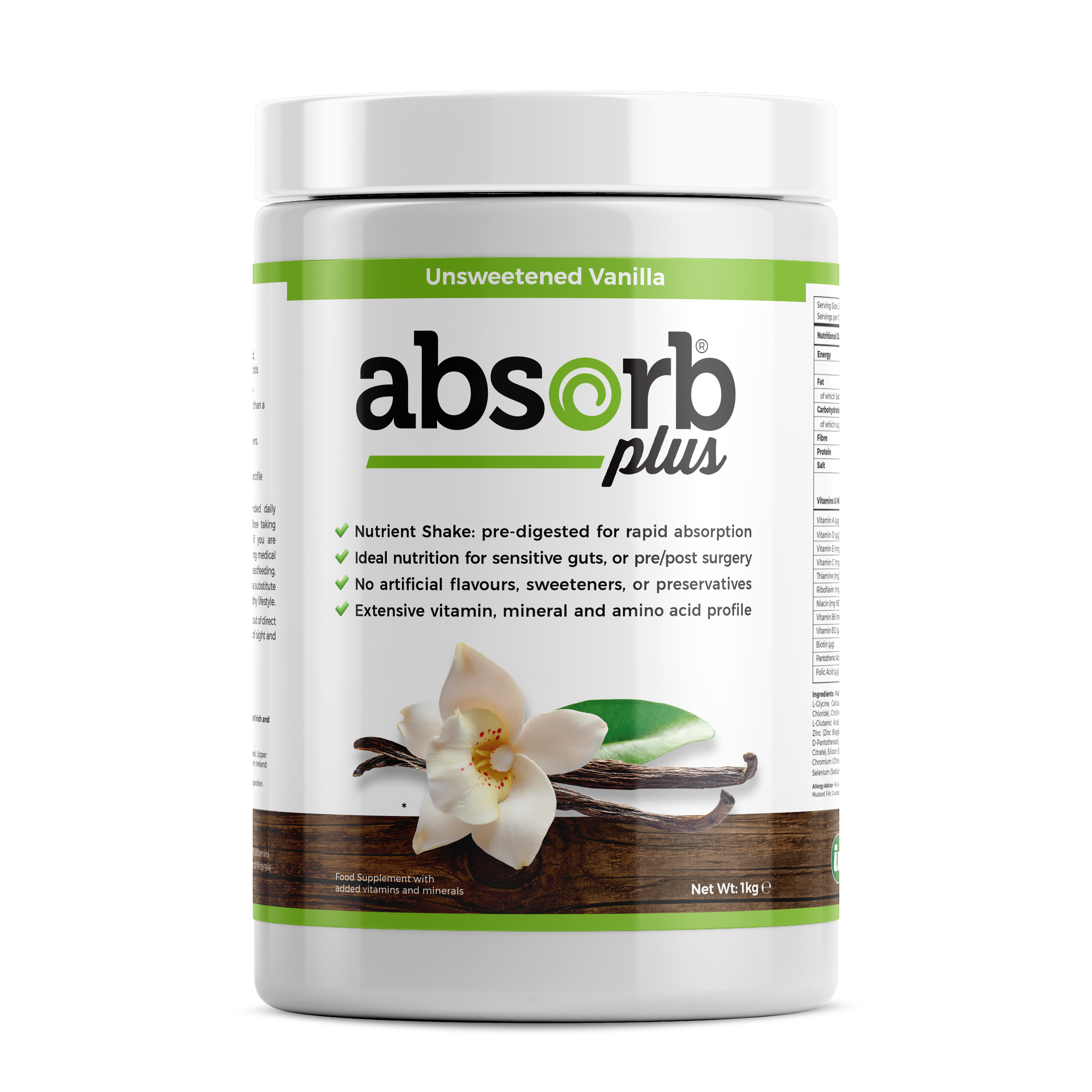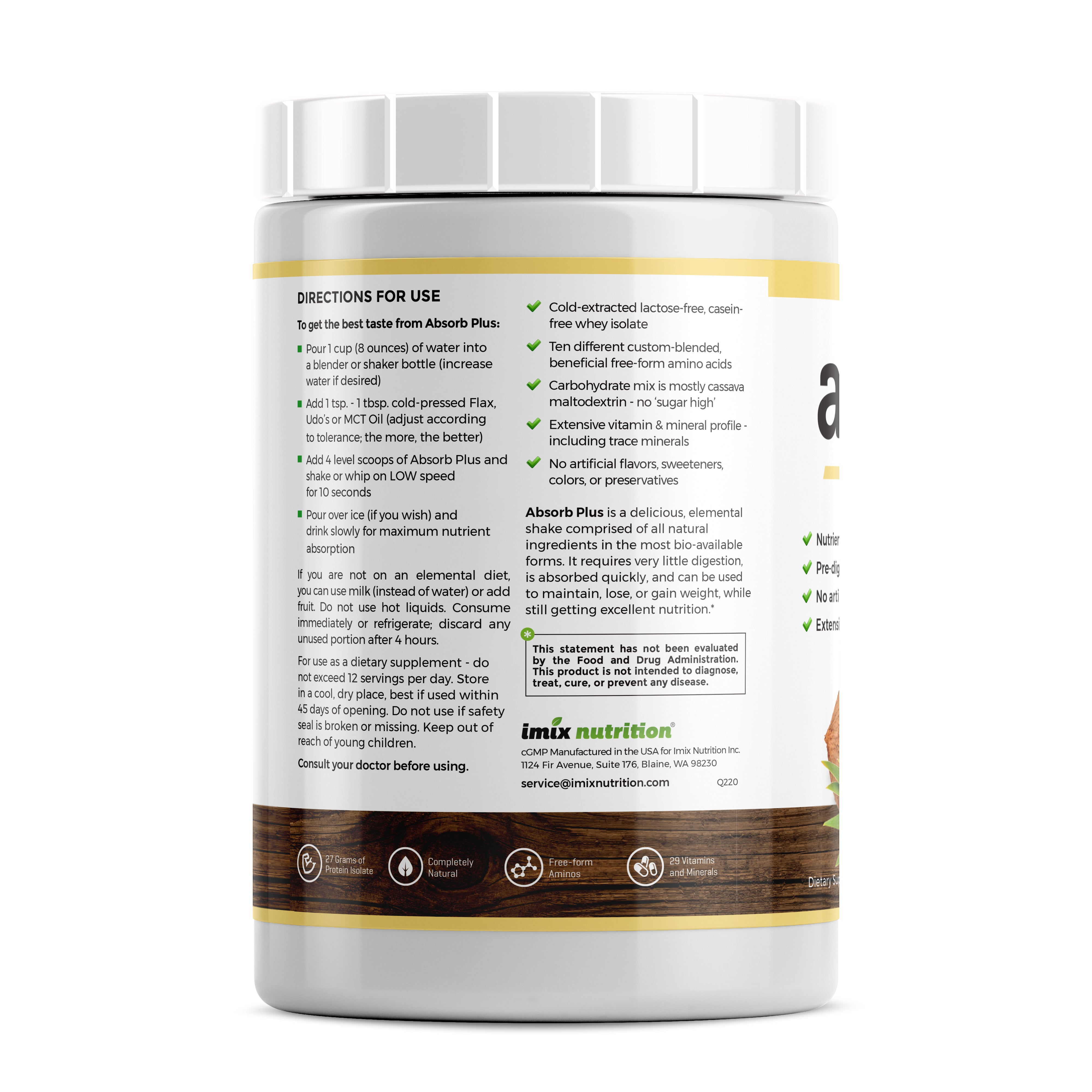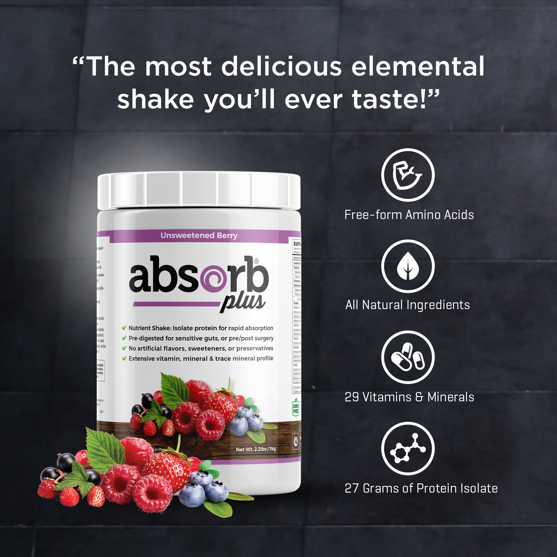 Absorb Plus was formulated by colon and bowel disorder expert Jini Patel Thompson to provide maximum nutrition to help build and strengthen your immune system and allow you to maintain or gain solid weight (muscle, not fat). Absorb Plus provides nutrients, supplements, protein (cold-extracted, lactose-free whey protein isolate) and carbohydrates (tapioca maltodextrin - from cassava root) in the most desirable forms and proportions, and in ratios that allow for optimum use and absorption. This liquid diet protein shake also includes an extensive array of therapeutic free-form amino acids (over 1000 mg L-Glutamine per serving!), with a superior vitamin and mineral profile (including trace minerals). Finally, Absorb Plus tastes so good, you can consume it up to 12 times a day if necessary!