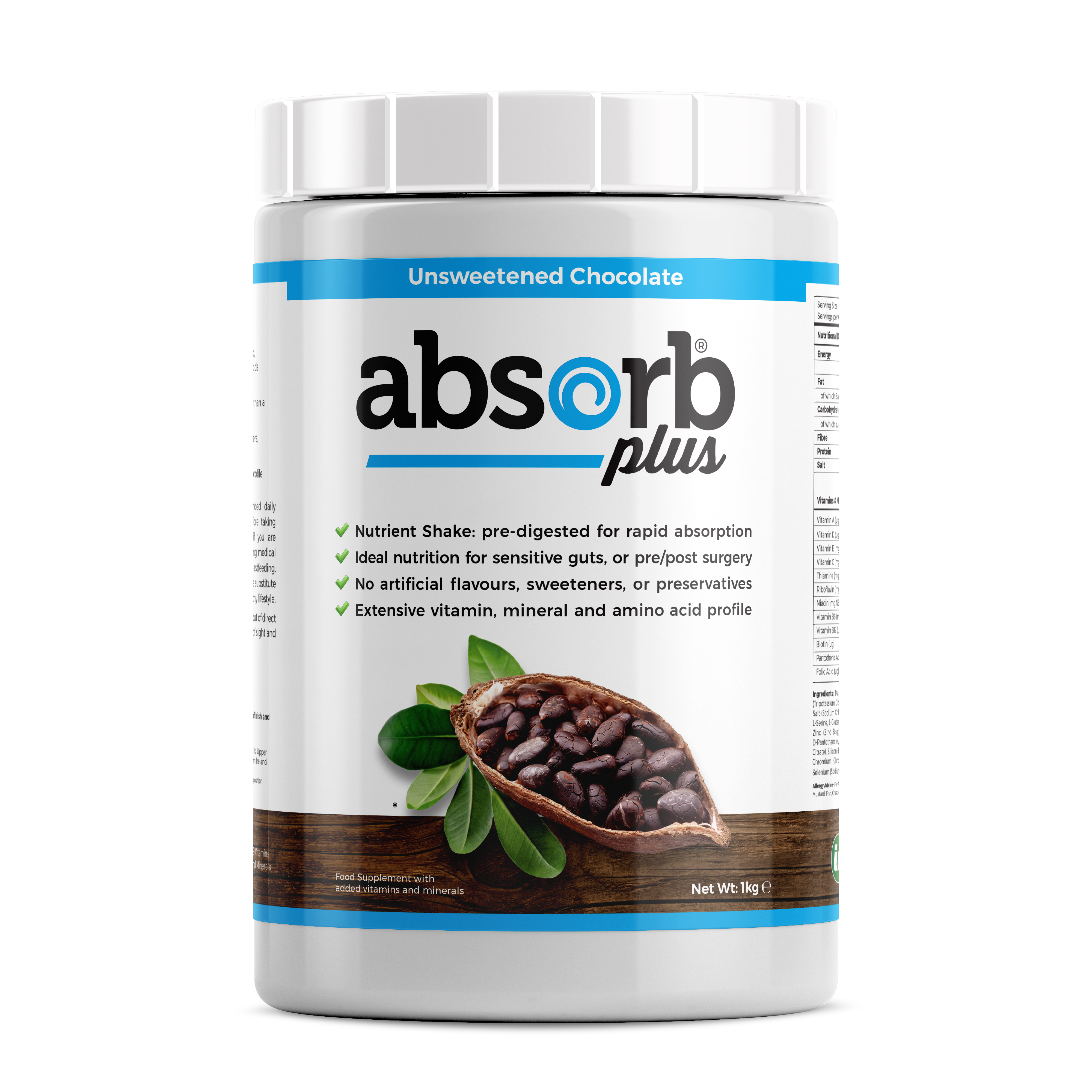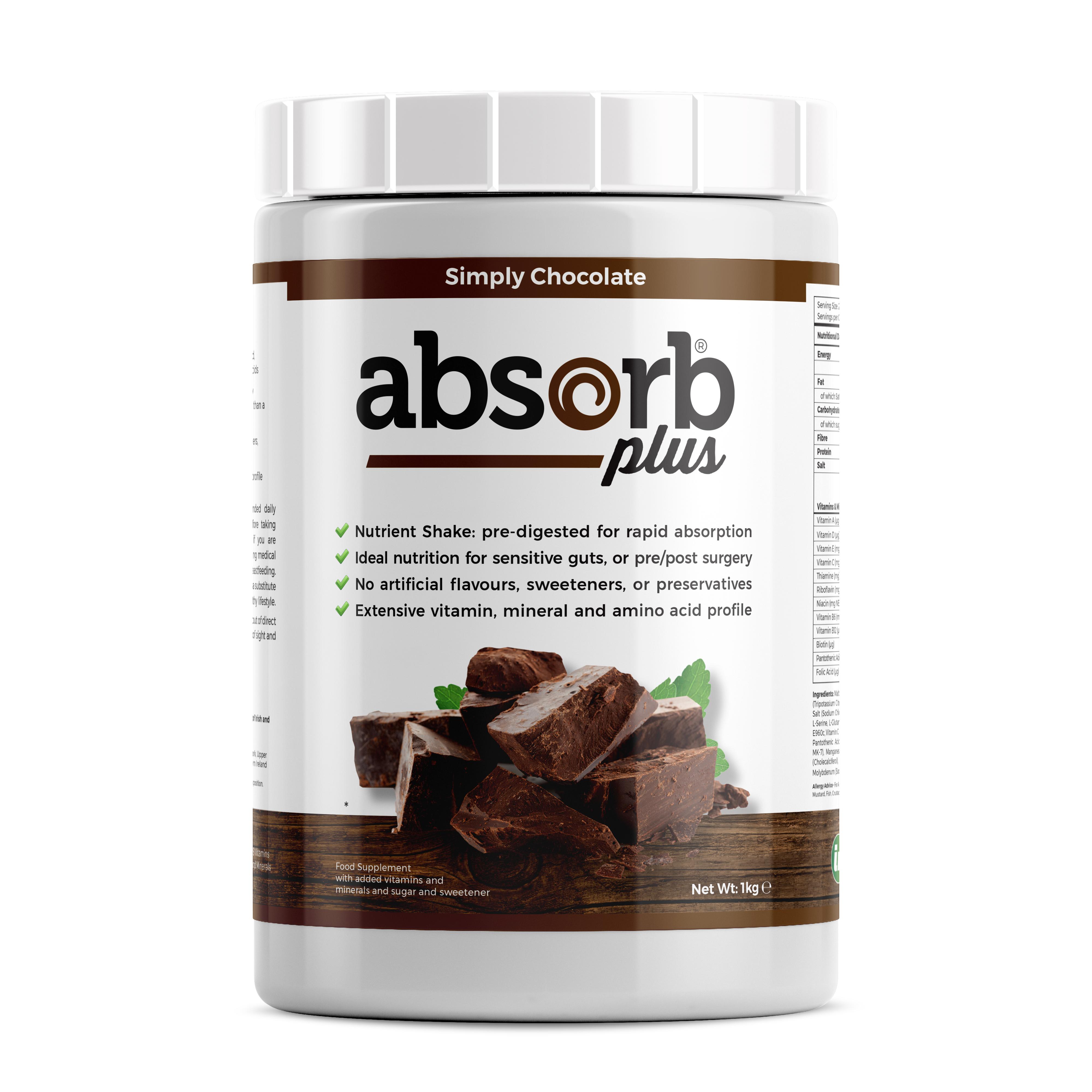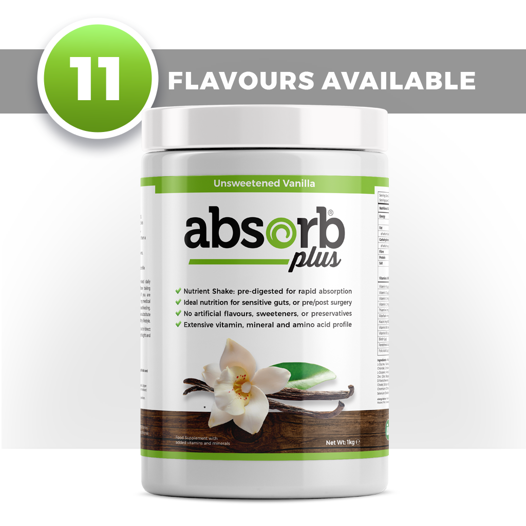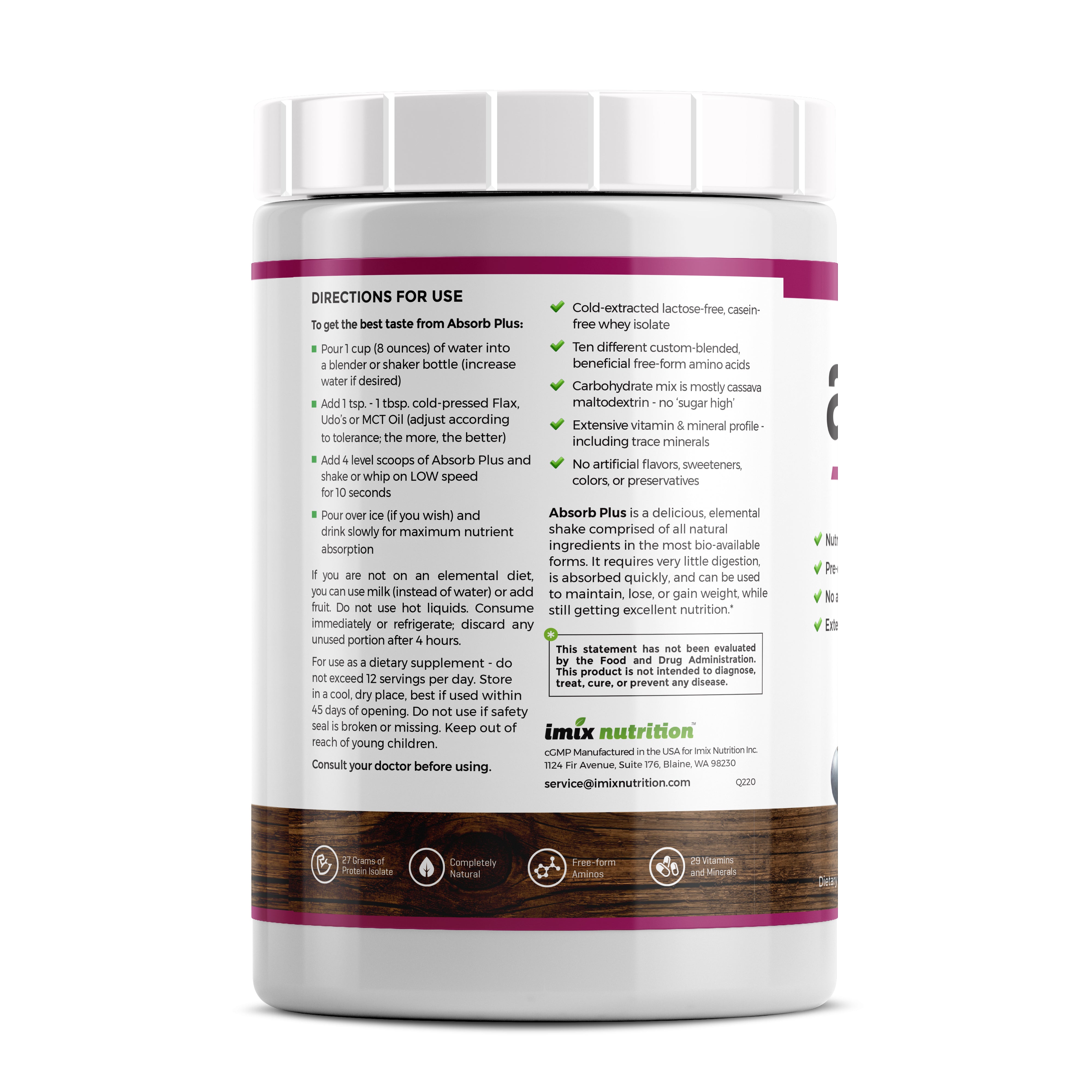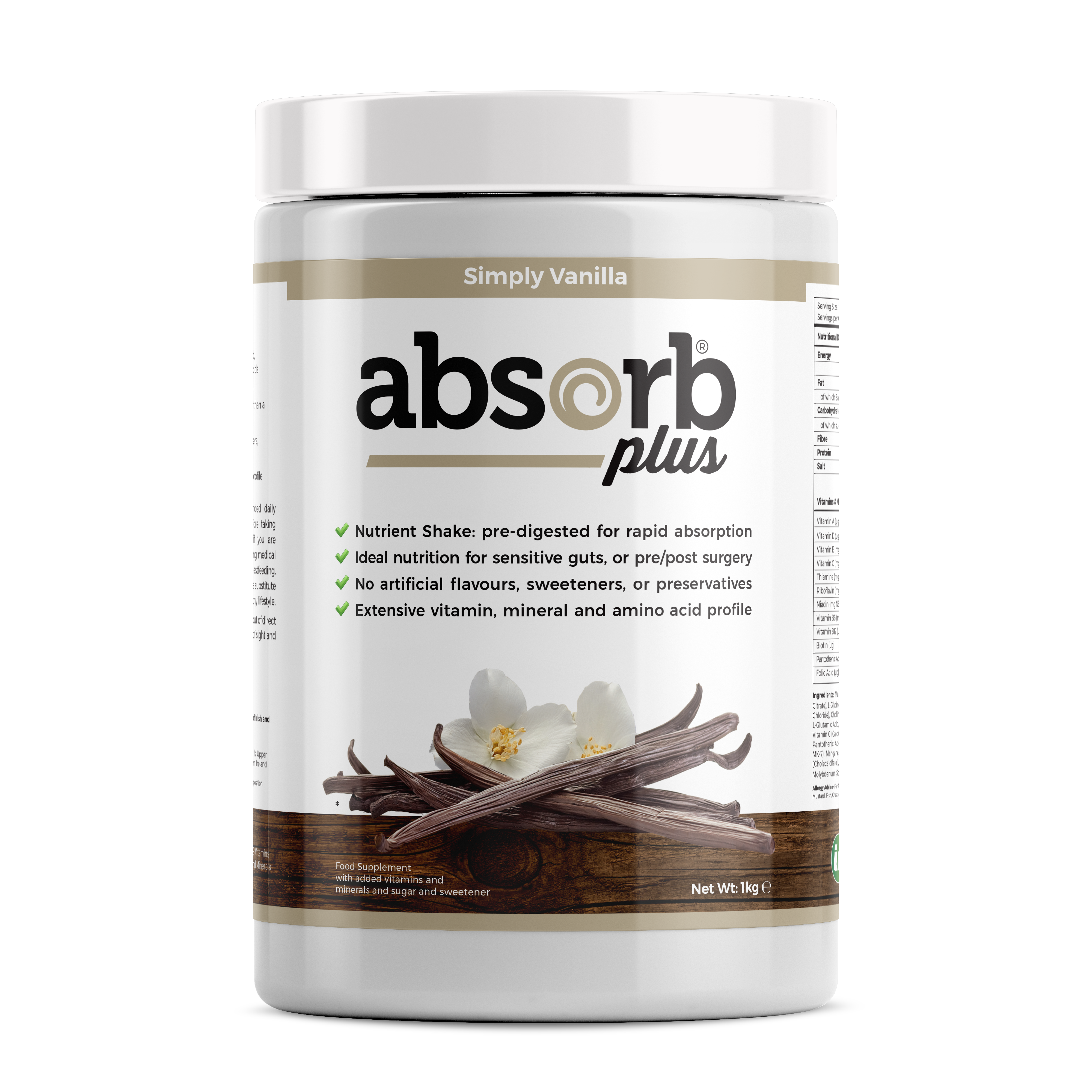 Absorb Plus was formulated by colon and bowel disorder expert Jini Patel Thompson to provide maximum nutrition to help build and strengthen your immune system and allow you to maintain or gain solid weight (muscle, not fat). Absorb Plus provides nutrients, supplements, protein (cold-extracted, lactose-free whey protein isolate) and carbohydrates (tapioca maltodextrin - from cassava root) in the most desirable forms and proportions, and in ratios that allow for optimum use and absorption. This liquid diet protein shake also includes an extensive array of therapeutic free-form amino acids (over 1000 mg L-Glutamine per serving!), with a superior vitamin and mineral profile (including trace minerals). Finally, Absorb Plus tastes so good, you can consume it up to 12 times a day if necessary!