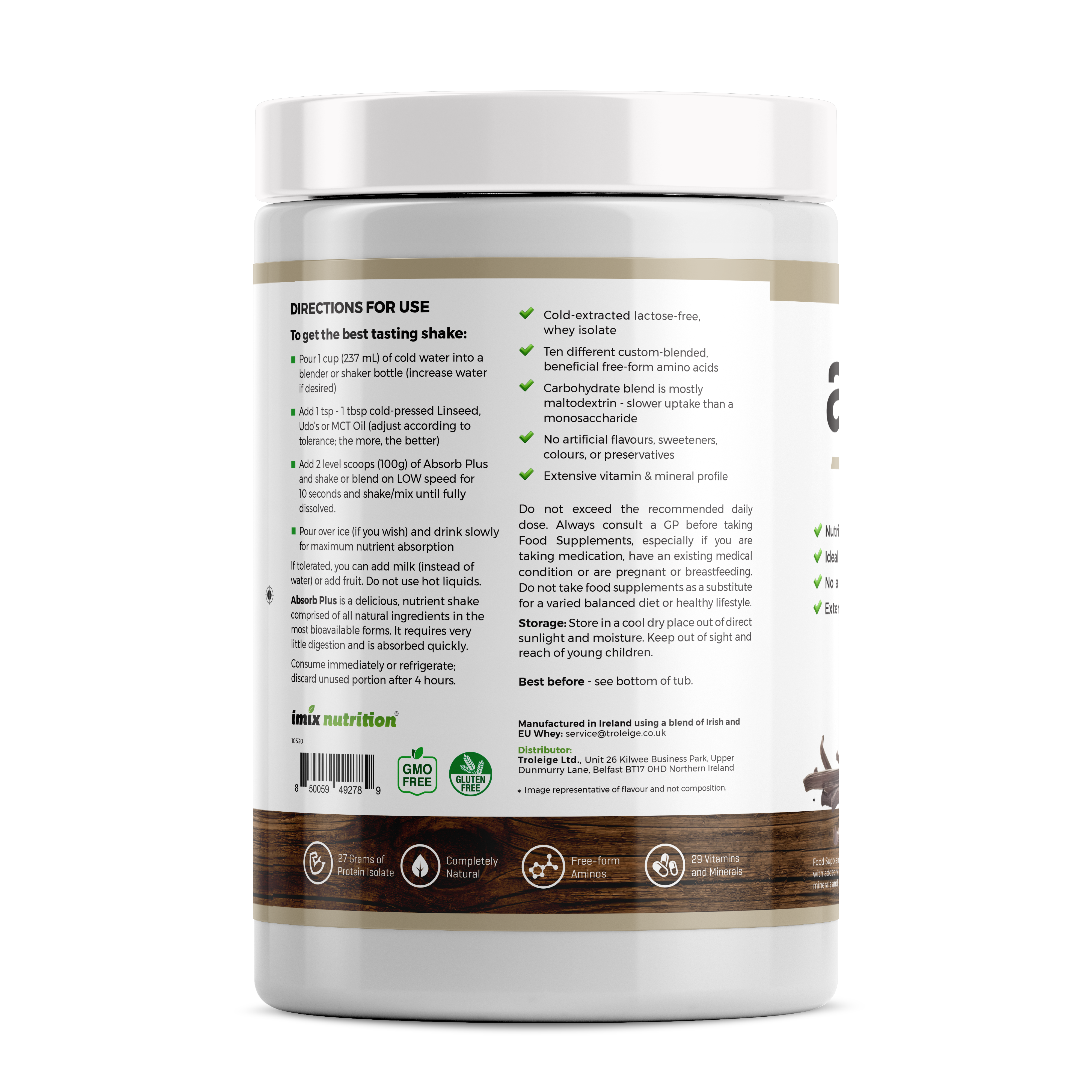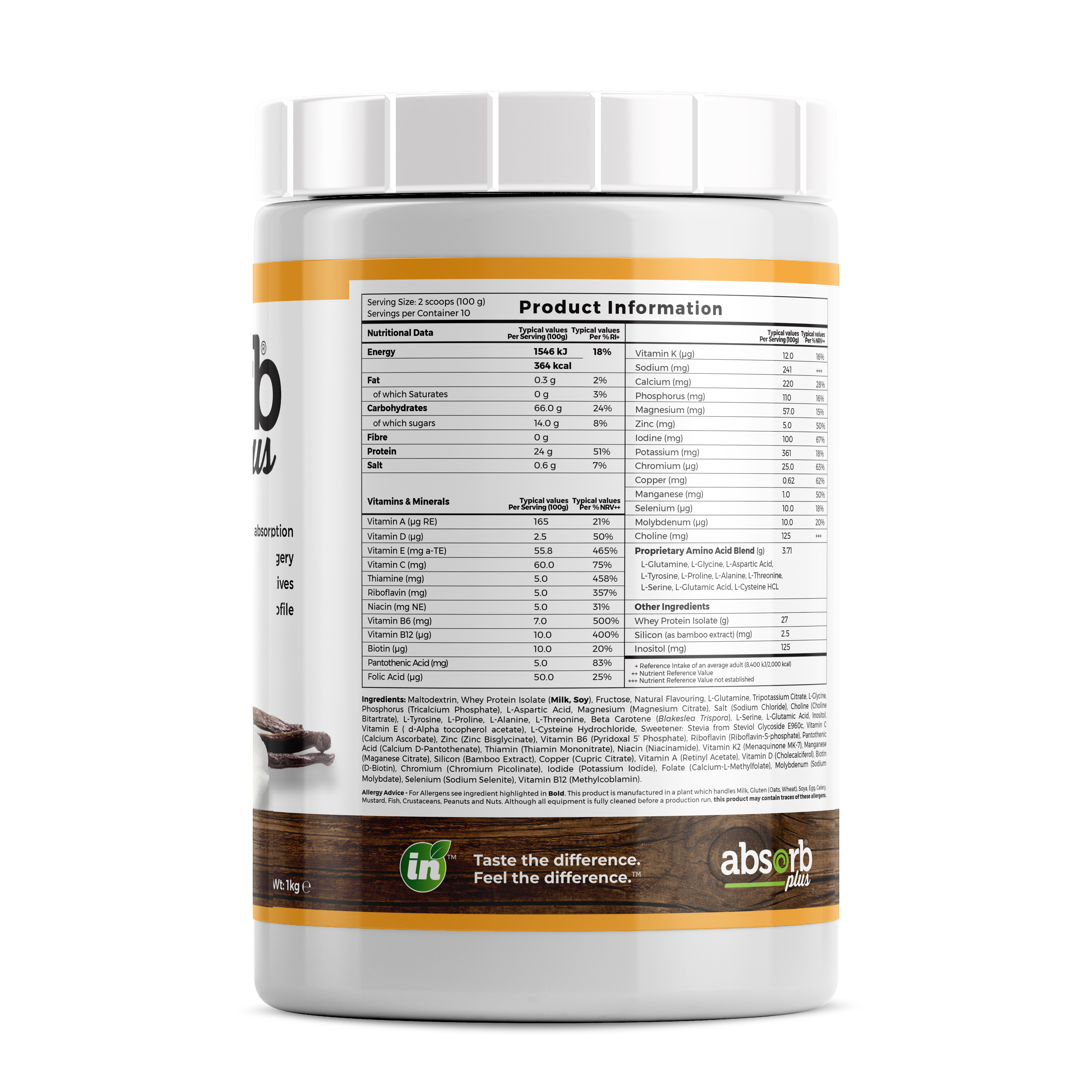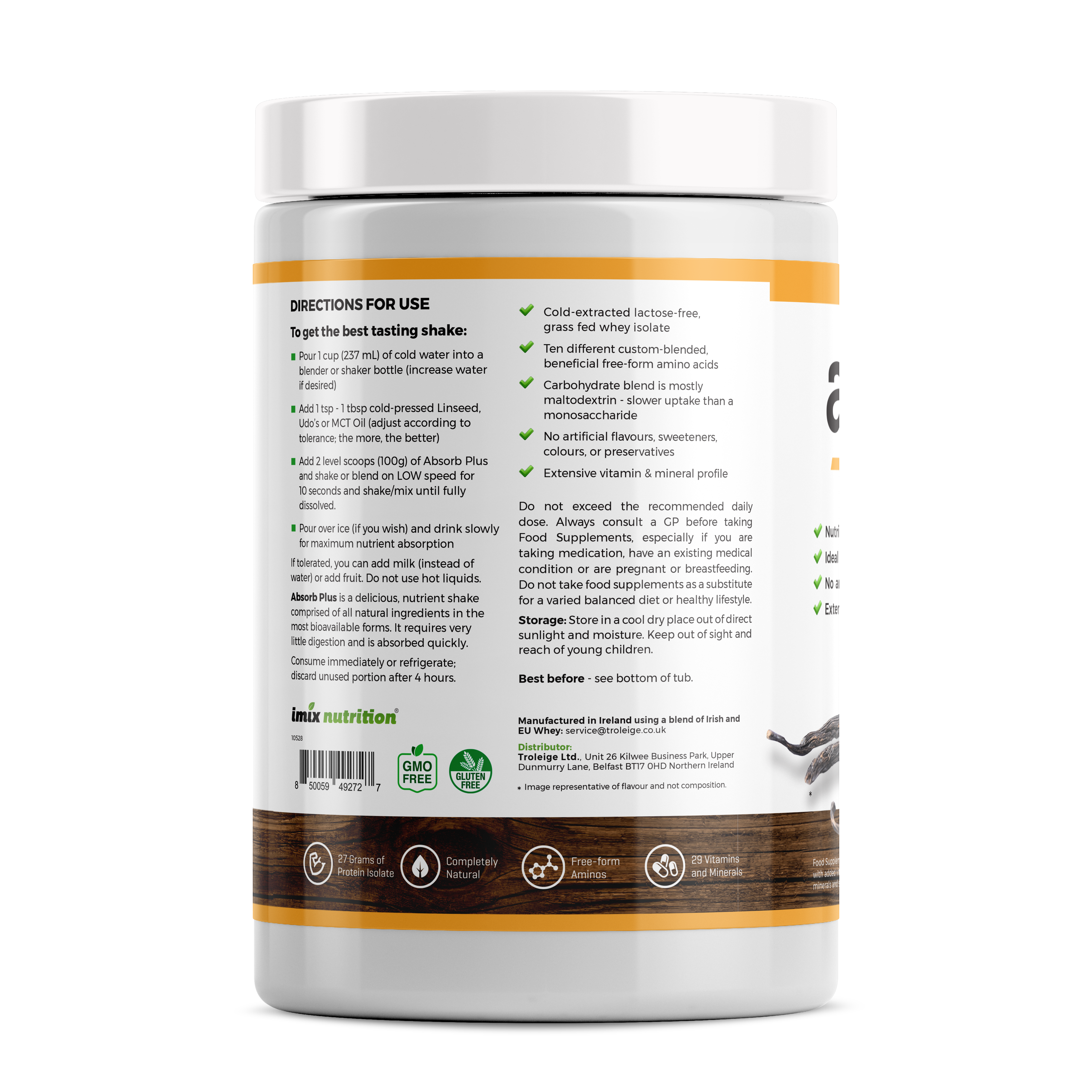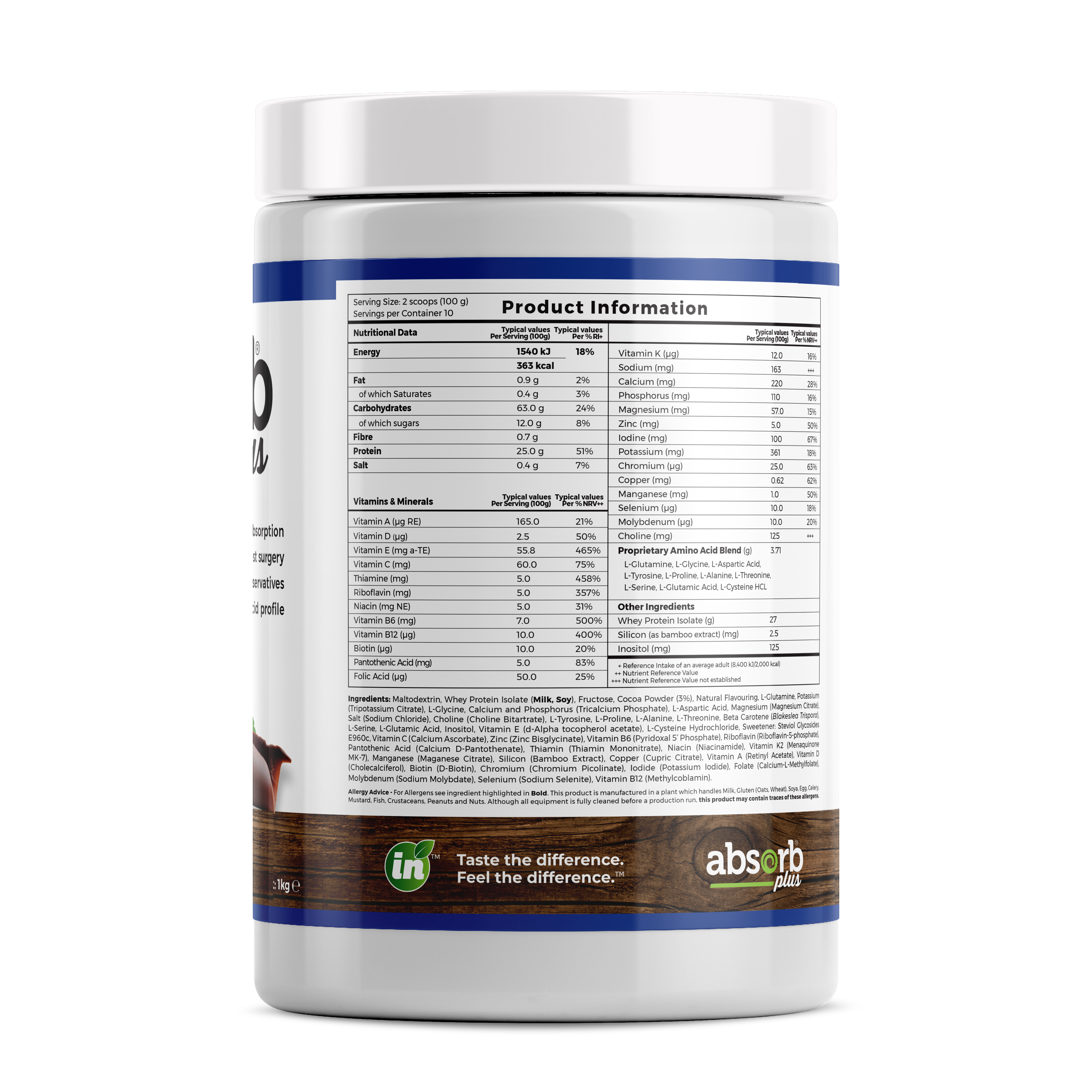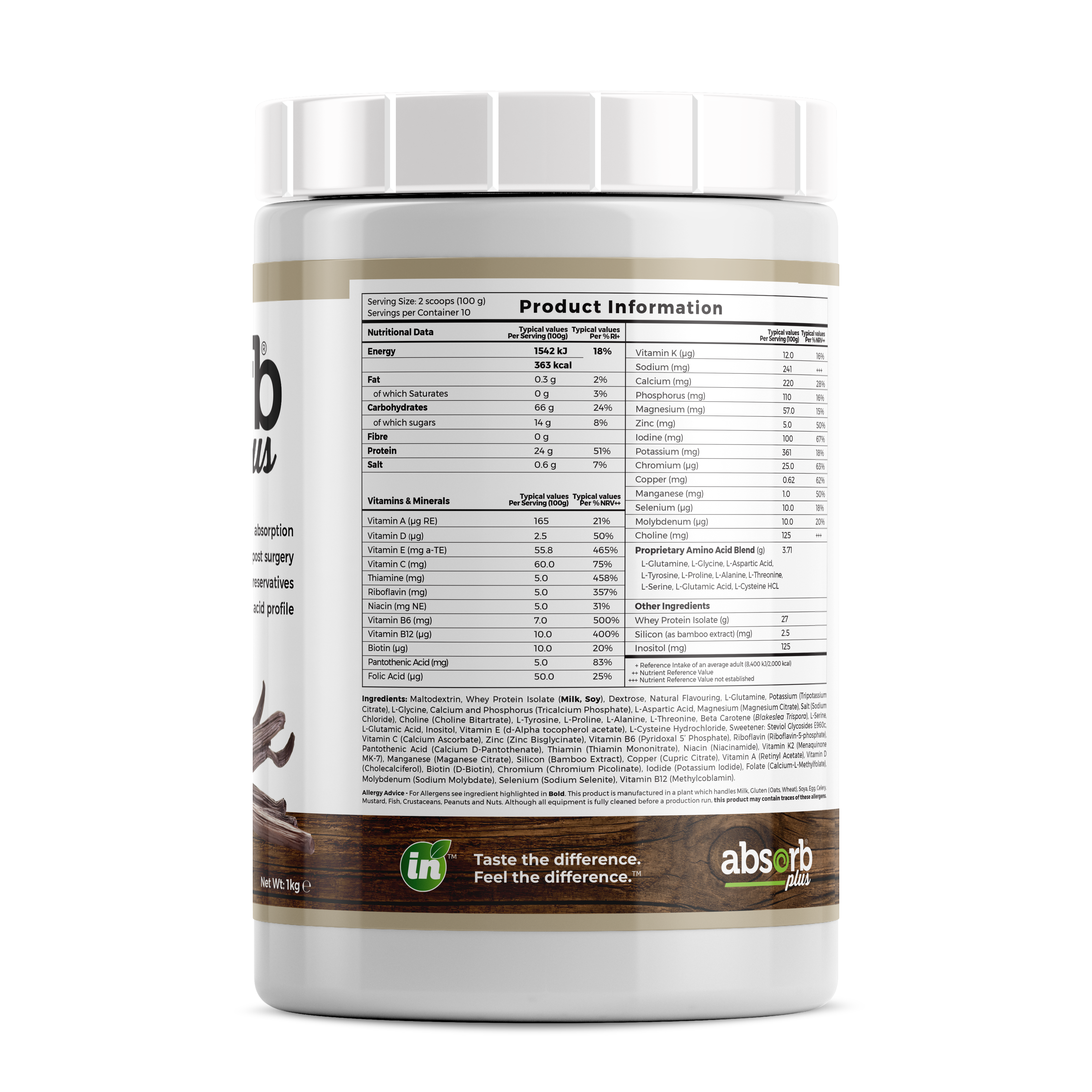 Absorb Plus was formulated by colon and bowel disorder expert Jini Patel Thompson to provide maximum nutrition to help build and strengthen your immune system and allow you to maintain or gain solid weight (muscle, not fat). Absorb Plus provides nutrients, supplements, protein (cold-extracted, lactose-free whey protein isolate) and carbohydrates (tapioca maltodextrin - from cassava root) in the most desirable forms and proportions, and in ratios that allow for optimum use and absorption. This liquid diet protein shake also includes an extensive array of therapeutic free-form amino acids (over 1000 mg L-Glutamine per serving!), with a superior vitamin and mineral profile (including trace minerals). Finally, Absorb Plus tastes so good, you can consume it up to 12 times a day if necessary!