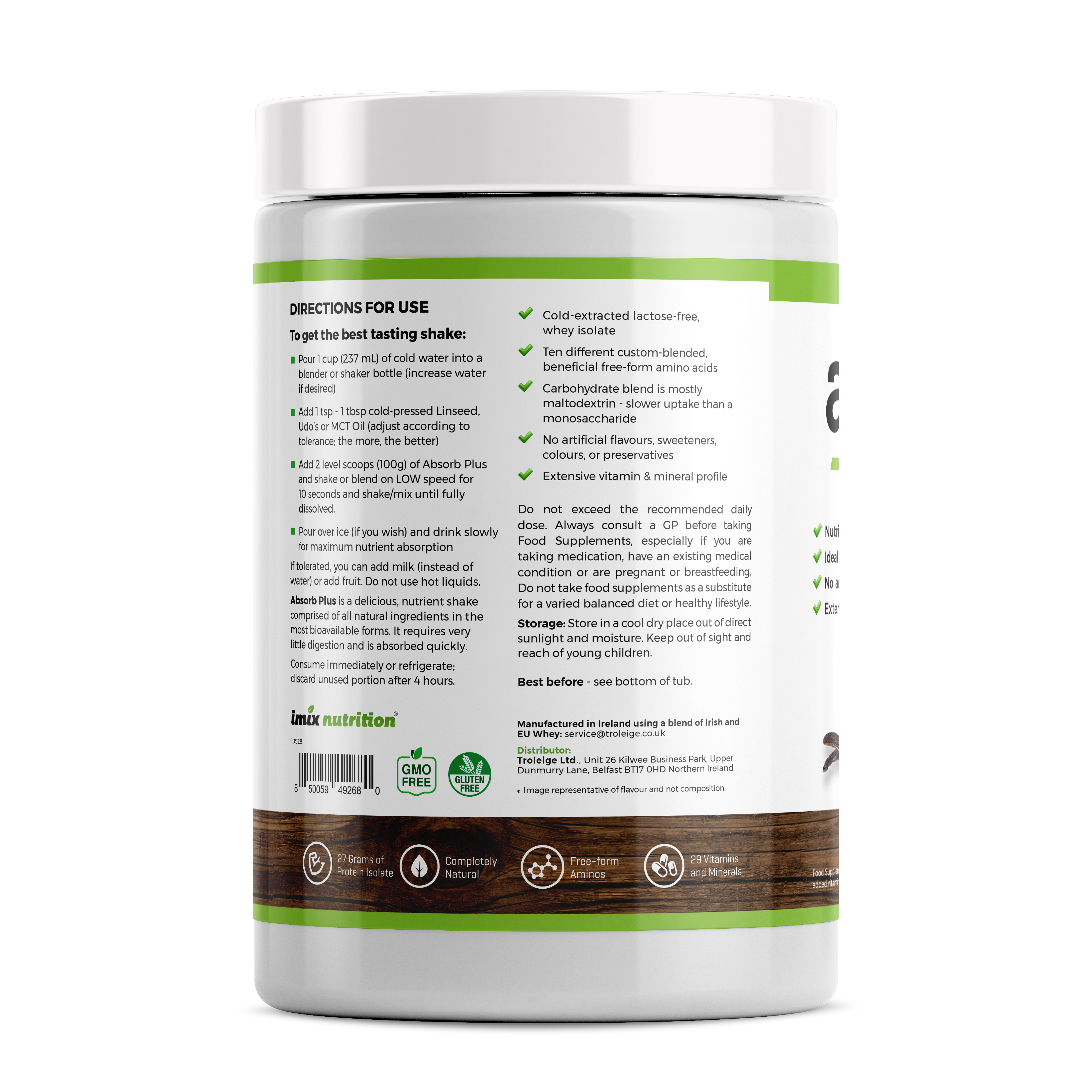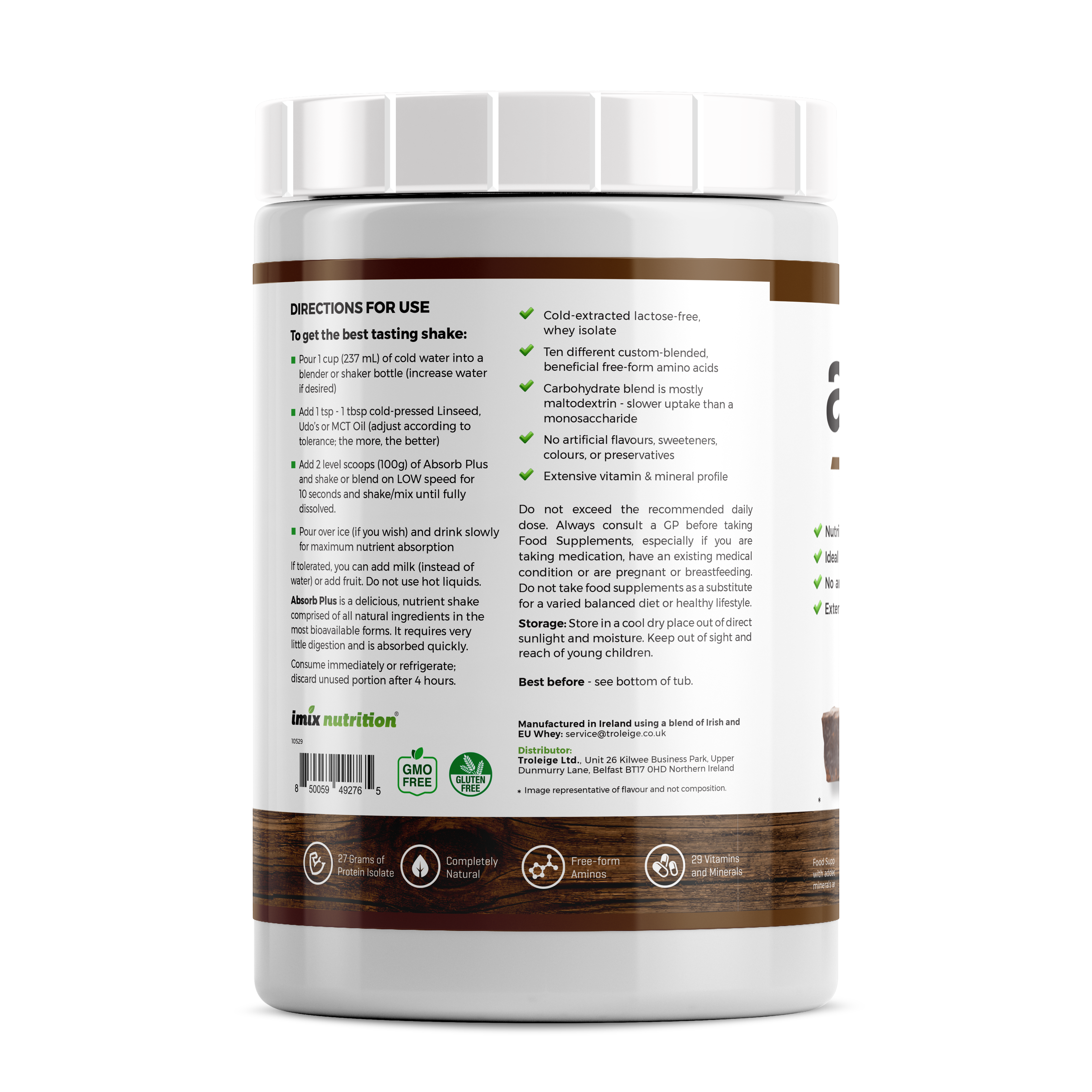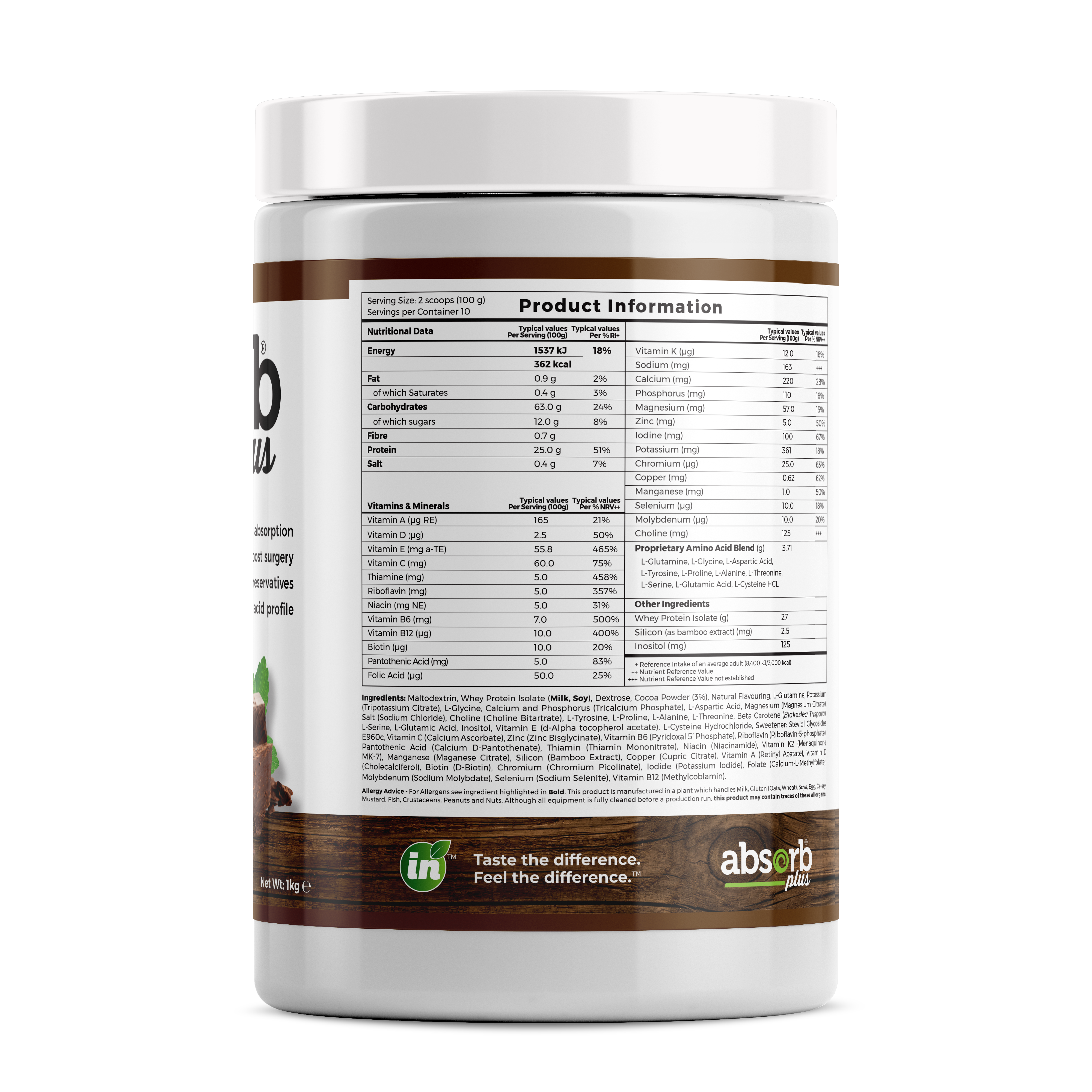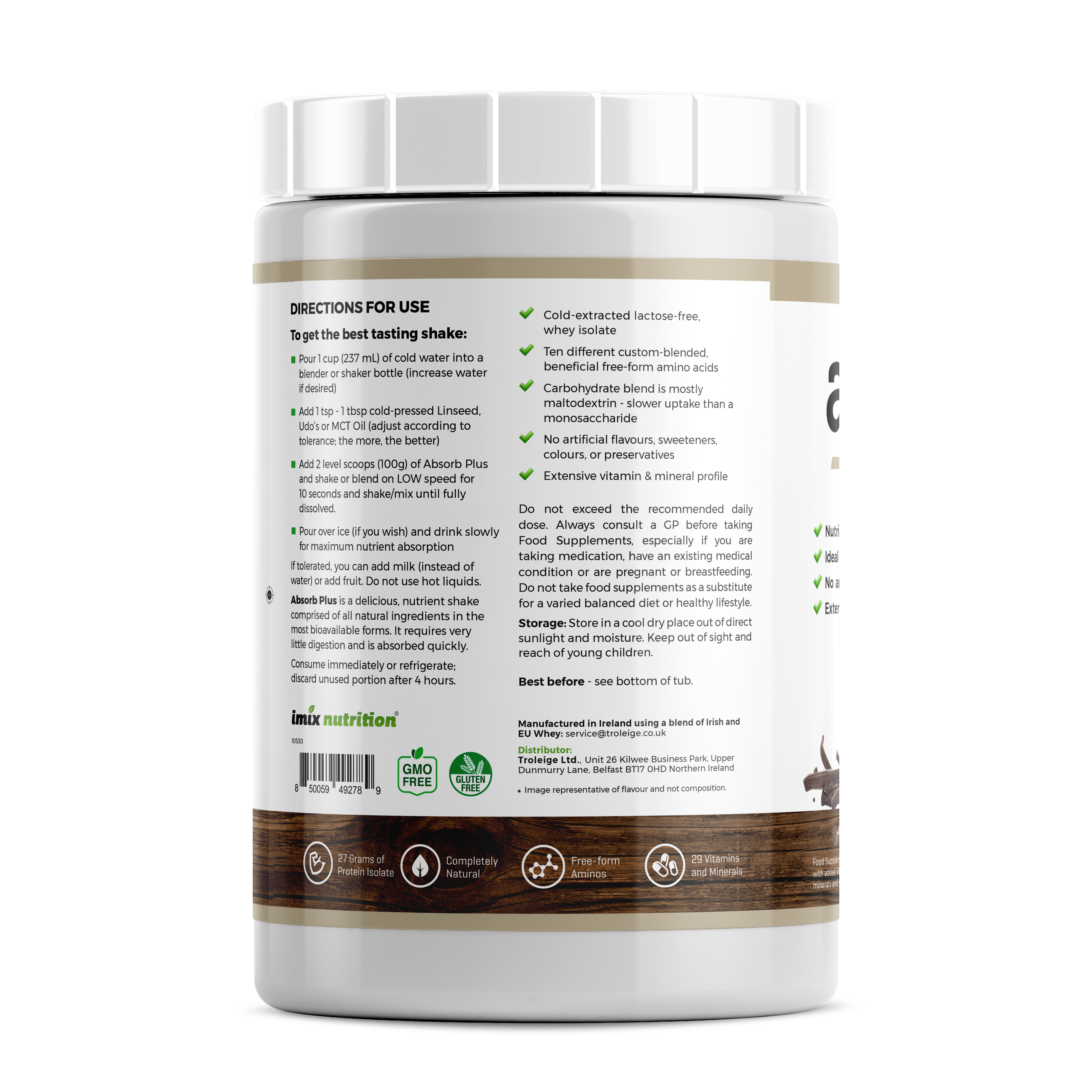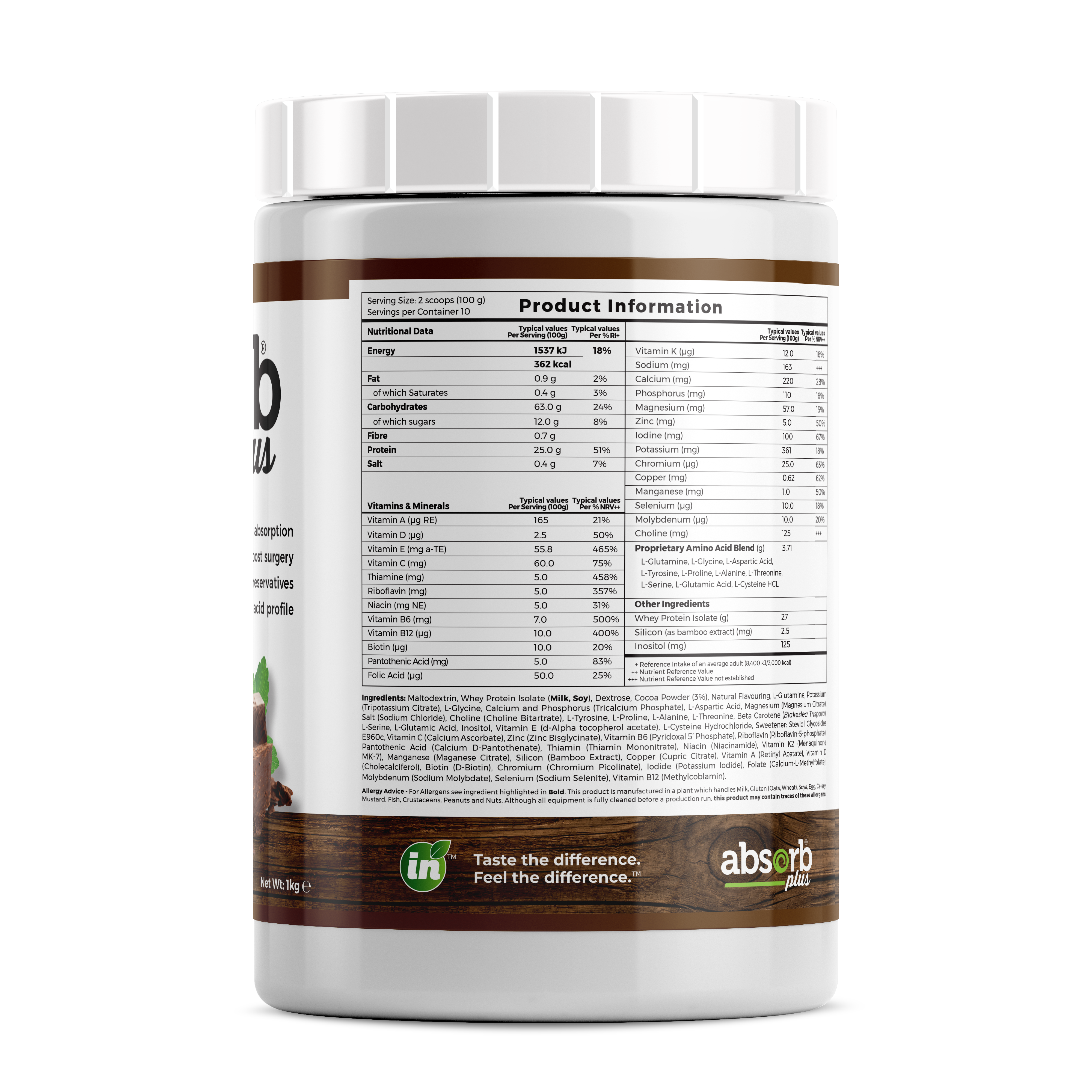 Absorb Plus was formulated by colon and bowel disorder expert Jini Patel Thompson to provide maximum nutrition to help build and strengthen your immune system and allow you to maintain or gain solid weight (muscle, not fat). Absorb Plus provides nutrients, supplements, protein (cold-extracted, lactose-free whey protein isolate) and carbohydrates (tapioca maltodextrin - from cassava root) in the most desirable forms and proportions, and in ratios that allow for optimum use and absorption. This liquid diet protein shake also includes an extensive array of therapeutic free-form amino acids (over 1000 mg L-Glutamine per serving!), with a superior vitamin and mineral profile (including trace minerals). Finally, Absorb Plus tastes so good, you can consume it up to 12 times a day if necessary!